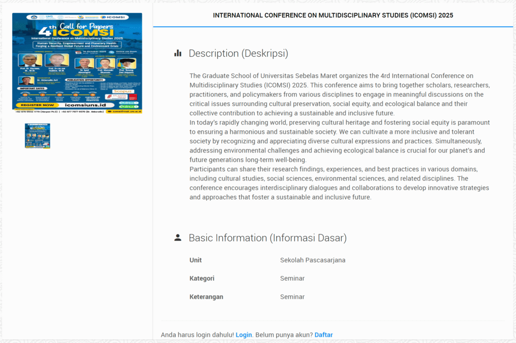 Through this conference, the Graduate School of Universitas Sebelas Maret reaffirms its commitment to academic excellence, global collaboration, and social responsibility. ICOMSI 2025 warmly invites researchers, academics, practitioners, policymakers, and students who share an interest in promoting sustainability, cultural diversity, and social justice to participate in this important scholarly gathering. Together, participants are encouraged to engage in critical discourse, present their research contributions, and collaborate in shaping a shared vision for a more resilient and harmonious global community.